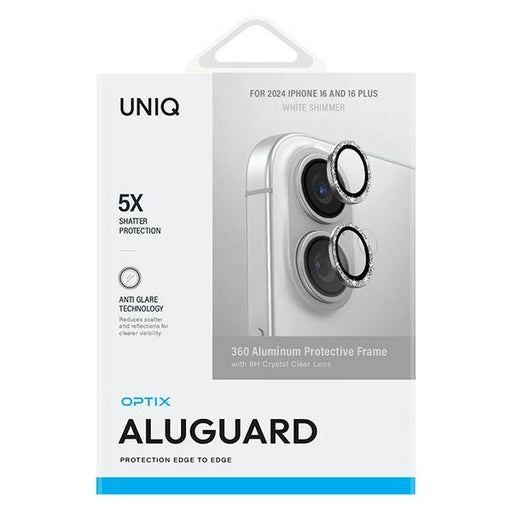 Uniq Optix Aluminum Camera Lens Protector iPhone 16 6.1" / 16 Plus 6.7" white shimmer camera lens glass with applicator